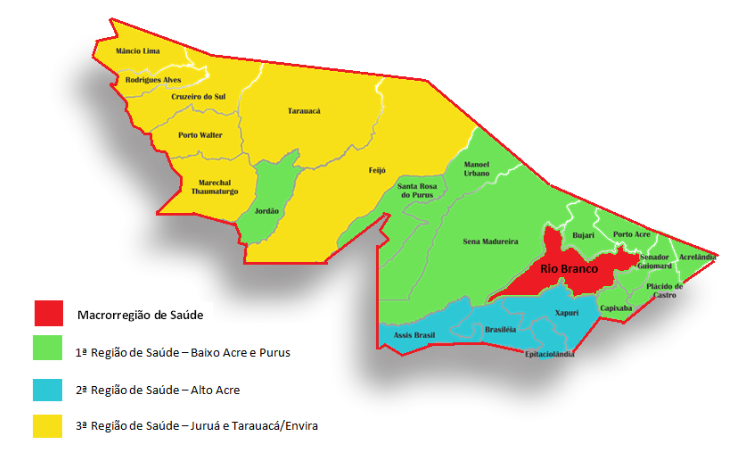 O Estado do Acre é formado por 3 (três) regiões de saúde e uma macrorregião, assim constituída: